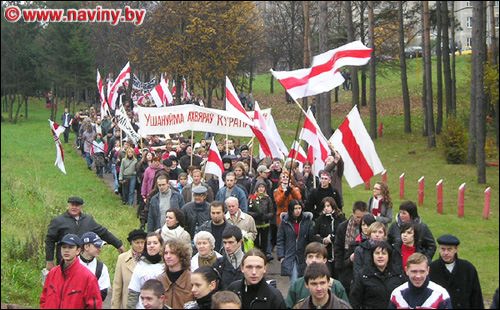 День памяти предков, по-народному именуемый Деды, 29 октября в Минске традиционно отметили шествием в Куропаты и мемориальным митингом. Само шествие к месту, где похоронены жертвы сталинских репрессий, казалось довольно праздничным. На фоне немноголюдных городских улиц, под пасмурным небом, длинная колонна (около 700 человек) с десятками бело-красно-белых флагов выглядела карнавально фееричной, привлекая к себе еще большее внимание скандированием: "У нас адна дарога — Беларусь для Бога", "Верым, можам, пераможам", естественным "Жыве Беларусь!" и спонтанно возникнувшим "Асцярожна, дрэвы!" (флаги, реющие высоко над головами митингующих, то и дело цеплялись за ветки).