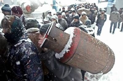 Студзень. Грузіны стаяць у чарзе, каб напоўніць балёны газам, Тбілісі