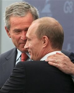 Ліпень. Прэзыдэнты ЗША Джордж Буш і Расеі Ўладзімір Пуцін на саміце "вялікай васьмёркі" ў Санкт-Пецярбурзе
