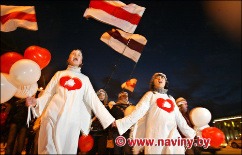Акция началась в форме театрализованного представления. Из расположенного на площади Архикафедрального костела вышли две девушки в костюмах ангелов с бело-красно-белым флагом и направились к собравшимся, после чего молодые люди отправились к посольству Франции (оно представляет в Минске интересы председательствующей в ЕС Словении).