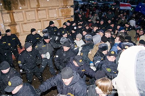 Части демонстрантов удалось прорвать два кордона милиции и двинуться от площади Якуба Коласа в сторону площади Победы. Бойцы спецназа вытесняли их во дворы, причем делали это жестоко, с применением силы. Спецназу фактически удалось рассеять толпу, разбить ее на несколько групп.