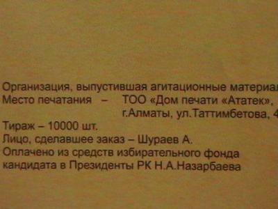 Любопытен тот факт, что листовки, как следует из выходных данных, напечатаны со средств из избирательного фонда кандидата в Президенты Республики Казахстан - Назарбаева. Смысловое наполнение листовки оставляло желать лучшего. Смешные обвинения в заговоре и совершенных преступлениях, искаженная правда, иногда и полная ложь - вот краткая характеристика содержания листовок.