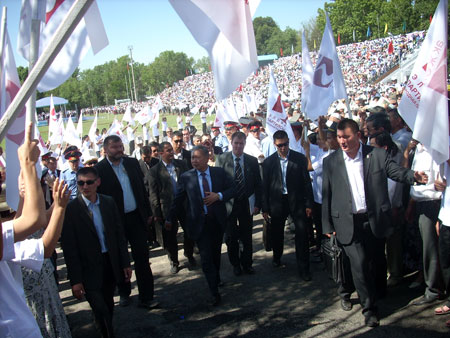 Кыргыз Республикасынын Президентигине талапкер К. С Бакиевдин сөзүнөн кийин ар бир райондон шайлоочулар чыгып сөз сүйлөө менен негизинен 4 жыл аралыгында өлкөбүздө аткарылып жаткан алгылыктуу иштерге ( Камбар –Ата -2, жаны мектептердин курулуусу, балдардын ысык тамак, жолдорду ремонттоо, пенсиянын көбөйүшү) ж.б социалдык-экономикалык маселелерге токтолушту.