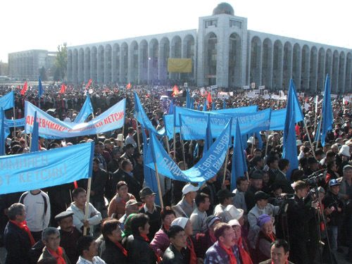 На главной площади столицы Кыргызстана начался митинг сторонников оппозиции президенту страны. По сообщению собственного корреспондента ИА ЫФергана.Рул А.Саипова, на площади собралось не менее десяти тысяч человек. Все выступающие оппозиционеры едины в своем требовании скорейшей отставки президента страны Курманбека Бакиева.