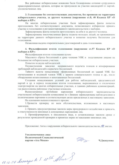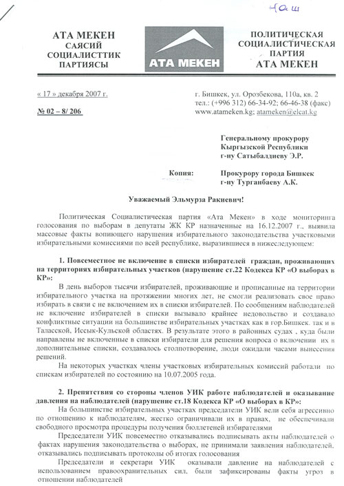 «..Политическая Социалистическая партия «АТА МЕКЕН» в ходе мониторинга голосования по выборам в депутаты ЖК КР, назначенные на 16.12.2007г., выявила массовые факты вопиющего нарушщения избирательного законодательства участковыми избирательными комиссиями по всей республике, выразившиеся в нижеследующем…»