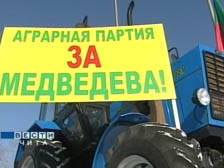 На пикет в поддержку кандидатуры Медведева на пост главы государства вышли более 50 представителей общественных и коммерческих сельскохозяйственных организаций Читинской области, работники Россельхозбанка, студенты и преподаватели Забайкальского аграрного института. Среди транспарантов как неотъемлемый символ сельскохозяйственного производства – трактор "Белорусь". Участники пикета, говоря о кандидатуре Дмитрия Медведева, отметили его вклад в реализацию приоритетных национальных проектов, в том числе и развитие программ агропромышленного комплекса. Сельское хозяйство Читинской области в тяжёлом состоянии, но с каждым годом развитию этой отрасли уделяют все больше внимания, говорили на пикете забайкальские аграрии.