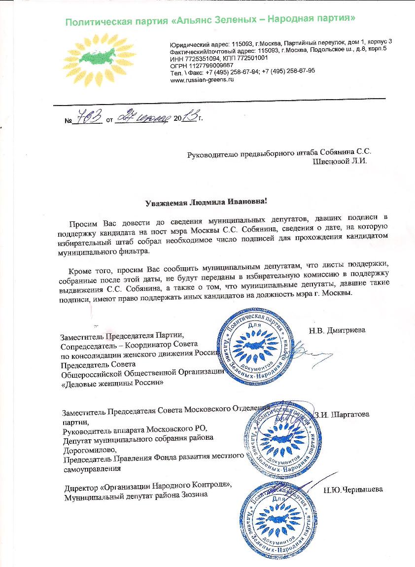 Председатель Движения по консолидации женского движения Наталья Дмитриева, Председатель Правления Фонда местного самоуправления, муниципальный депутат Зоя Шаргатова и Директор «Организации Народного Контроля», муниципальный депутат Наталья Чернышева обратились к Руководителю предвыборного штаба С.С. Собянина Людмиле Швецовой с просьбой довести до сведения депутатов, давших подписи в поддержку кандидата на пост мэра Москвы С.С. Собянина, сведения о дате, на которую избирательный штаб собрал необходимое количество подписей для прохождения кандидатом муниципального фильтра.