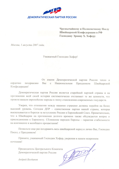 Председатель Центрального Комитета Демократической партии России Андрей Богданов направил поздравление Чрезвычайному и Полномочному Послу Швейцарской Конфедерации в Российской Федерации господину Эрвину Х. Хоферу поздравление по случаю национального праздника - Дня Конфедерации.
