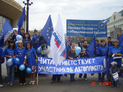 22 августа 2007г. в г.Чите в 10 часов на Театральной площади состоялась встреча участников автопробега Владивосток-Москва-Брюссель. На встречу пришли активисты Читинского регионального отделения политической партии "Демократическая партия России" во главе с председателем регионального отделения Чупиковой Еленой Александровной. Читинцы встречали участников автопробега Хлебом-солью. Была подарена памятная книга о городе Чите и журнал о Забайкальском крае.