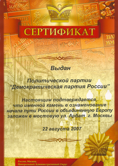 Сегодня, 22 августа, на Старом Арбате, на аллее именных камней, Демократическая партия России заложла собственный именной камень в поддержку европейского выбора России и вступления России в Европейский Союз.