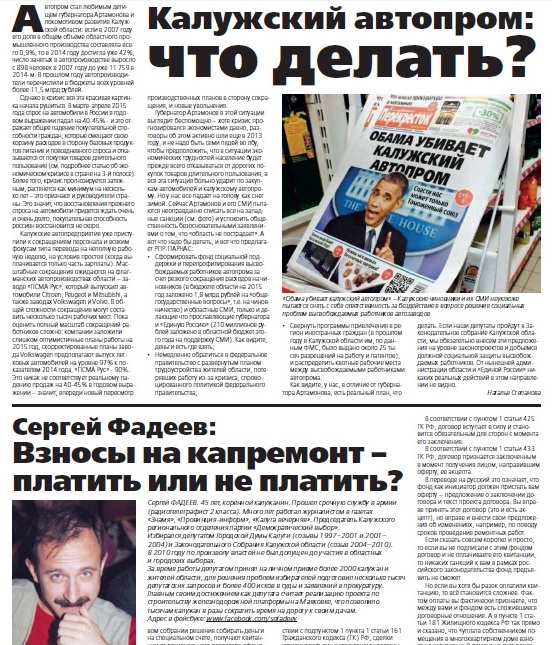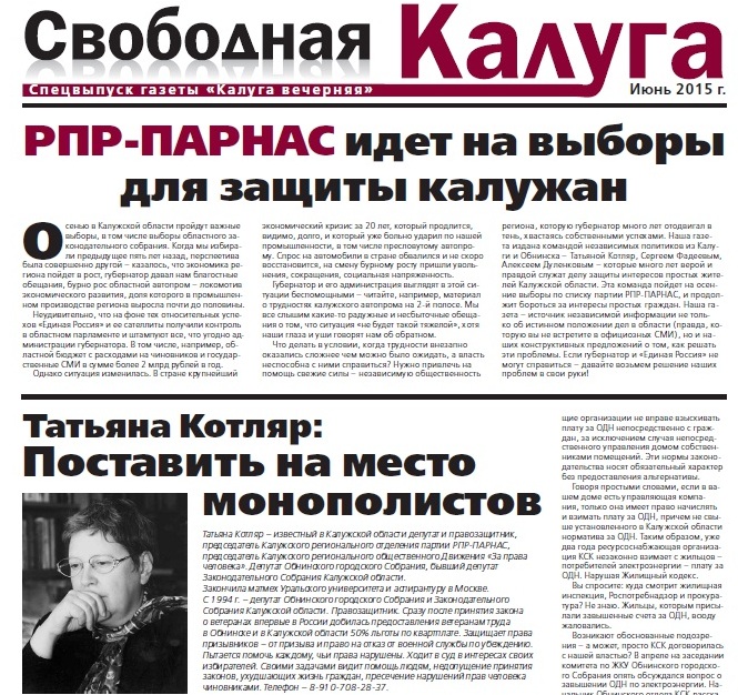 Демократическая коалиция, , начинает активную агитационную кампанию в российских регионах. Сегодня Алексей Навальный опубликовал , а мы публикуем изданную нами совместно с партией РПР-Парнас агитационную газету, изданную тиражом в 150 тысяч экземпляров для жителей Калужской области. Наша газета представляет кандидатов в депутаты Калужского областного Законодательного собрания (в том числе и лидера "Демократического выбора" в Калуге Сергея Фадеева), а также простым и доступным языком рассказывает о ключевых проблемах, волнующих жителей области - от проблем калужского автопрома и сокращения расходов на здравоохранение и образование до борьбы с произволом энергетических монополистов и действий в связи с введением платы за капремонт жилых домов. Газета призывает калужан принять активное участие в предстоящих областных выборах, а также .