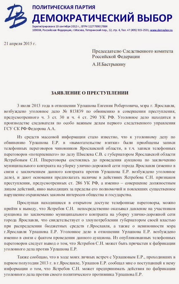 Лидер "Демократического выбора" Владимир Милов с просьбой провести проверку по фактам вероятного совершения ярославским губернатором Ястребовым преступления, предусмотренного ст.286 УК (превышение должностных полномочий) в связи с публикацией рядом СМИ записей телефонных переговоров Ястребова с "бизнесменом" Шмелевым, добившимся возбуждения уголовного дела против мэра Ярославля Евгения Урлашова, который по этому обвинению вот уже почти два года сидит в тюрьме. Как следует из телефонных переговоров, Ястребов фактически координировал действия Шмелева перед пресловутым аукционом, в отношении которого Урлашову вменяют "вымогательство взятки". Фактически налицо фабрикация уголовного дела. Напомним, что отставки губернатора Ястребова активно добивался еще при жизни Борис Немцов.