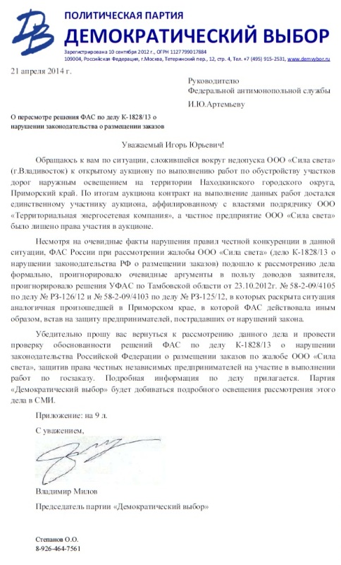 Партия "Демократический выбор" обратилась к главе ФАС Игорю Артемьеву с просьбой вмешаться в ситуацию с нарушением законодательства о конкуренции и госзакупках при размещении госзаказа на обустройство участков дорог наружным освещением на территории Находкинского городского округа, Приморский край. Соответствующий госконтракт по итогам аукциона, проведенного с нарушениями, достался единственному участнику аукциона, аффилированному с властями подрядчику ООО «Территориальная энергосетевая компания», а частное предприятие ООО «Сила света» было лишено права участия в аукционе. Мы просим И.Артемьева вернуться к рассмотрению данного дела, ранее отклоненного ФАС. Партия «Демократический выбор» намерена продолжать активно действовать для защиты права честных независимых предпринимателей на участие в выполнении работ по госзаказу.