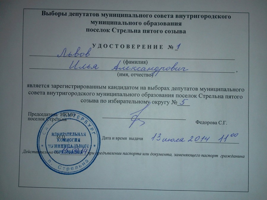 Вчера избирательная комиссия муниципального образования поселок Стрельна в Санкт-Петербурге зарегистрировала Илью Львова кандидатом в депутаты муниципального совета поселка Стрельна по избирательному округу №5. Выборы пройдут в единый день голосования 14 сентября. На днях кандидатом в депутаты местного совета Адмиралтейского района лидер петербургского отделения "Демократического выбора" Иван Летюхин.