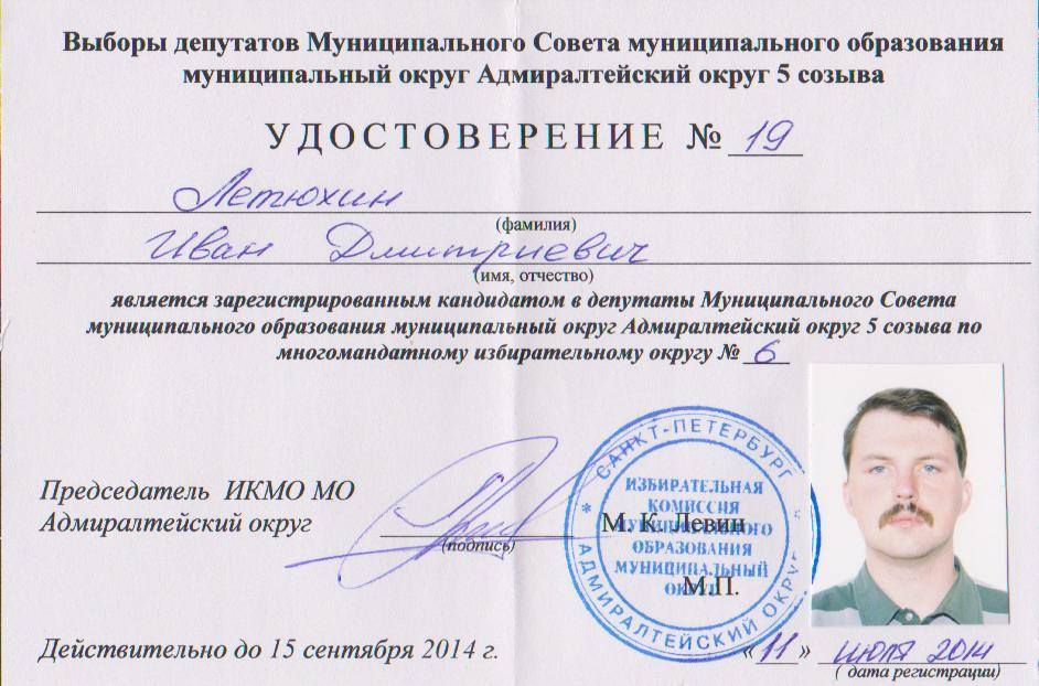 Вчера избирательная комиссия Адмиралтейского округа в Санкт-Петербурге зарегистрировала председателя Санкт-Петербургского отделения "Демократического выбора" Ивана Летюхина кандидатом в депутаты муниципального совета Адмиралтейского округа по многомандатному избирательному округу №6. Выборы пройдут в единый день голосования 14 сентября.