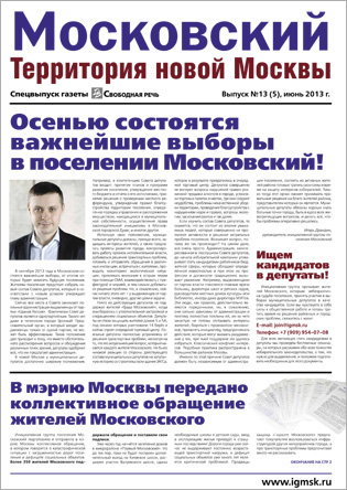 Вышел в свет новый номер газеты "Свободная речь" - специальный выпуск для поселения Московский на территории Новой Москвы (). В фокусе выпуска - предстоящие в сентябре на территории Новой Москвы муниципальные выборы, вопросы уплотнительной застройки, дефицита транспортной и социальной инфраструктуры в застраиваемых районах, экология, борьба с нелегальной торговлей спиртным, состояние спортсооружений.