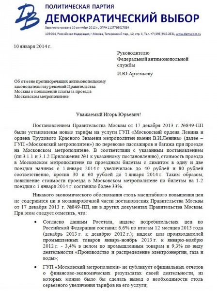 Партия "Демократический выбор" официально обратилась в Федеральную антимонопольную службу с требованием отменить решение правительства Москвы о повышении платы за проезд в московском метрополитене с 1 января по билетам на 1 и 2 поездки до 40 и 80 рублей соответственно ().