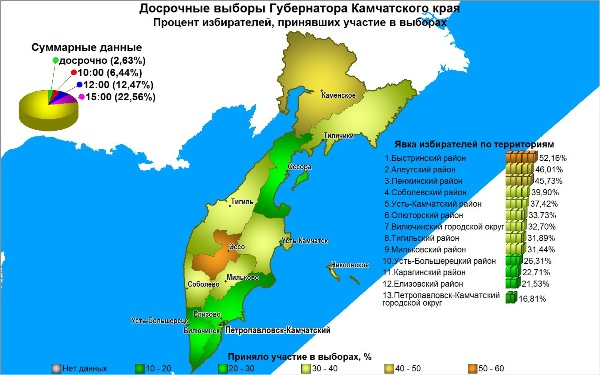 По информации избирательной комиссии Камчатского края, по состоянию на 15 часов утра по местному времени (06 мск), отдать свой голос на губернатора на свои избирательные участки пришли 53 тысячи 879 человек, что составляет 22,56% от общего количества избирателей.
