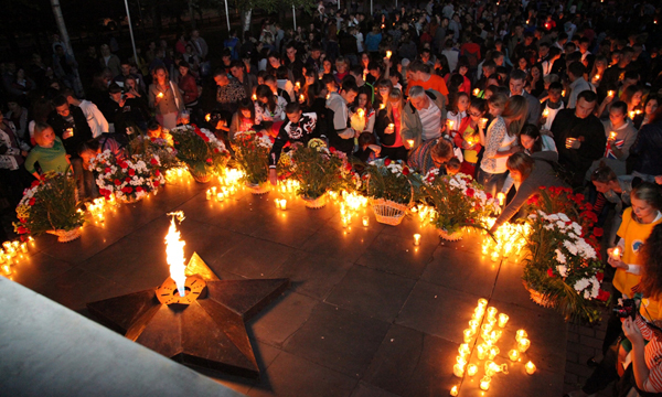 Горожане, объединившись в колонну, прошли по улицам Биробиджана. Каждый нес в руке зажженную свечу. Завершилось шествие в сквере Победы, где каждый поставил свою свечу к Вечному огню на мемориале воинам, павшим на фронтах тех сражений.