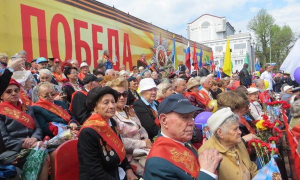 На площади Октябрьской революции, установили трибуны для ветеранов, а также огромные экраны, по которым транслируются передачи федеральных и местных телеканалов, затем состоялся праздничный митинг.