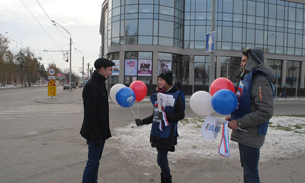 Активисты местного отделения «Единой России» вместе с «Молодой Гвардией Единой России» в пятницу, 4 ноября, вышли на проспект Ленина чтобы поздравить горожан с государственным праздником. В нескольких точках - у памятника Сеятелю, на отметке «Нулевой километр», у ЦУМа и концертного зала «Сибирь» - участники акции вручали прохожим праздничные флажки, ленты-триколор и воздушные шары.