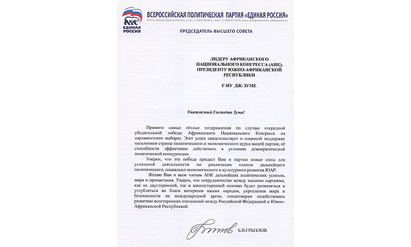 Поздравление лидеру партии Африканский национальный конгресс (АНК), президенту Южно-Африканской Республики Джейкобу Зуме по случаю очередной убедительной победы партии на парламентских выборах направил председатель Высшего совета партии «Единая Россия» Борис Грызлов.