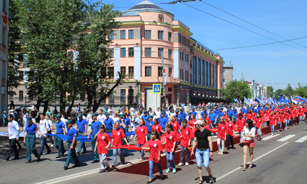 После митинга стартовала областная акция «Живой флаг». Три колонны иркутян с белым, синим и красным 50-метровыми полотнищами образовали живой флаг. В шествии до площади у стадиона «Труд» приняли участие первые лица города и области.