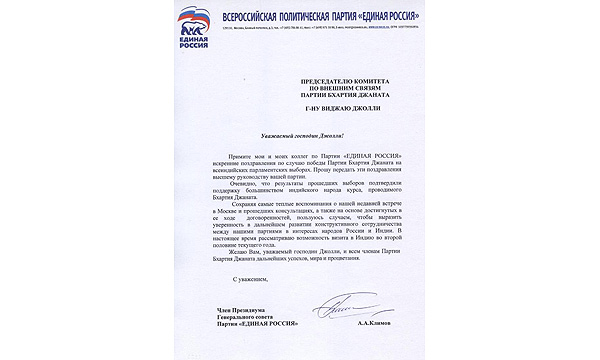 Поздравления председателю Комитета по внешним связям партии Бхартия Джаната Виджаю Джолли в связи с победой партии на всеиндийских парламентских выборах направил член Президиума Генерального совета партии «Единая Россия» Андрей Климов.