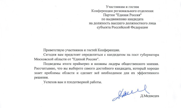 Текст приветствия председателя «Единой России», в частности, гласит: «Сегодня вам предстоит определиться с кандидатом на пост губернатора Московской области от «Единой России». Подведены итоги праймериз и названы лидеры общественного мнения. Рассчитываю, что вы выберете самого достойного кандидата, который хорошо знает проблемы области и сделает всё необходимое для их эффективного решения».