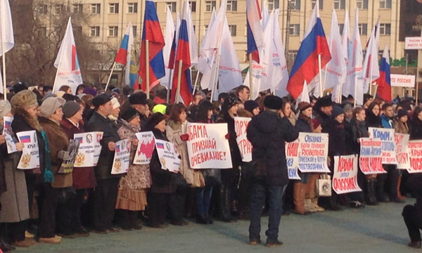 Забайкальцы, пришедшие на митинг, выразили поддержку президенту России Владимиру Путину и его действиям по защите соотечественников, а также выступили в защиту целостности и неделимости России. Так же выступающие, а это представители ветеранских и молодежных организаций, независимых профсоюзов, учителя и студенты, были едины во мнении, что возвращение Крыма в Россию стало возможным, в первую очередь, благодаря свободному волеизъявлению жителей полуострова, их желанию быть в составе РФ.