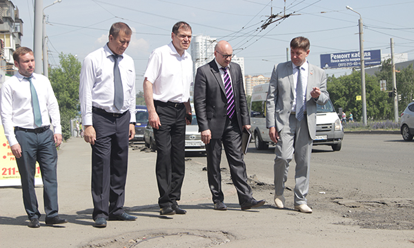 Парламентарии проверили участок дороги с новым асфальтовым покрытием на пересечении ул. Краснознаменная и Братьев Кашириных и качество подготовки к укладке асфальта на участке Свердловского проспекта от ул. Труда до проспекта Ленина.