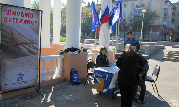 Накануне 70-летия Победы Орловское региональное отделение партии «Единая Россия» предложило написать письмо ветерану. Поздравить ветеранов Великой Отечественной войны, проживающих на территории города Орла, мог любой желающий. У входа в городской парк был установлен стол, подготовлены листы бумаги и списки имён ветеранов, которым орловцы адресовали слова признательности и поздравления с Днём Победы.