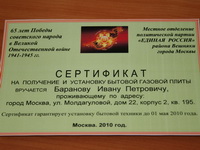 16 апреля в Восточном округе стартовала благотворительная программа местного отделения Партии «ЕДИНАЯ РОССИЯ», посвященная празднованию 65-летия Победы в Великой Отечественной войне. В период избирательной кампании в Партию поступали наказы от пожилых избирателей о бесплатной замене кухонных плит и индивидуальных приборов учета воды. В Москве реализуется множество программ социальной поддержки населения, в том числе и по замене, с учетом норм очередности, выслужившей сроки бытовой техники пенсионерам и малообеспеченным категориям граждан. Тем не менее, политсовет окружной партийной организации принял решение до юбилея Великой Победы реализовать партийный проект по замене кухонных плит и индивидуальных приборов учета воды всем участникам ВОВ, признанным нуждающимися в такой поддержке.В рамках проекта инициативной группой членов Партии были собраны средства на приобретение 276 газовых и 86 электрических кухонных плит, 161 комплекта индивидуальных приборов учета воды. Принципиальной партийной позицией было приобретение только отечественной бытовой техники. С районными обслуживающими организациями была достигнута договоренность на бесплатный монтаж оборудования. Открывал проект секретарь политсовета окружной партийной организации, префект Восточного округа Николай Евтихиев. Вместе с членами окружного политсовета Александром Аксеновым и Еленой Хаустовой, Николай Евтихиев вручил первую плиту участнику Великой Отечественной войны Оскару Израйлевичу Шустеру, проживающему в районе Соколиная гора. После получения и установки плиты Оскар Израйлевич пригласил гостей к столу на чашку чая. Партийцы в ходе доверительной беседы узнали, что Оскар Израйлевич - коренной москвич. Войну встретил в Столице. Несовершеннолетним юношей работал на оборонительных рубежах у села Балабаново. В первые дни войны потерял отца на фронте. А в 1943 году пришел и его черед идти на войну. Воевал под городом Невель Ленинградской области, дошел до Белорусского Витебска, где был тяжело ранен и направлен в госпиталь. За боевые заслуги награжден Орденом Отечественной войны II степени, Медалью за победу над Германией и другими юбилейными медалями. После войны занимался космическими разработками.Одновременно реализовывать благотворительный проект начали в районах Вешняки, Богородское и Новокосино. В Вешняках депутат Московской городской Думы Вера Степаненко вместе с секретарем районной партийной организации Александром Романовым вручили сертификаты на получение и установку газовых плит 10 ветеранам ВОВ. Партийцы района Вешняки гарантируют реализацию сертификатов до 1 мая 2010 года. В Новокосино новые электролиты «Мечта» встретили своих двух новых хозяек Анну Панкову и Веру Кулагину. Плиты были доставлены в точно назначенное время при помощи подрядных организаций района. Встретить гостей из районной партийной организации 85-летняя Анна Панкова вышла в хорошем настроении, ведь не часто жизнь преподносит такие подарки. Мастер из районного ДЕЗ подключил новую электроплиту буквально за 15 минут, и гости вместе с хозяйкой тут же опробовали ее в действии.«В годы войны я трудилась в тылу, с 1942 года работала на электроламповом заводе в Москве. Мне тогда было всего 17 лет. Я хочу сказать спасибо всем тем людям, кто сделал для меня такой подарок к 65-ой г