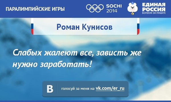 По условиям конкурса любой желающий до 4 марта мог разместить свой девиз и/или фото в поддержку паралимпийской сборной России на странице в официальной группе Партии в социальной сети. Затем были отобраны 15 лучших девизов, которые продолжили борьбу за главный приз.