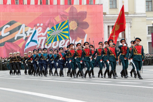 Торжественным маршем по Дворцовой площади прошли 2500 военнослужащих, в их числе впервые после нескольких лет перерыва были нахимовцы, суворовцы и кадеты. Парадные расчеты сменила боевая техника: бронетанковые машины «Тигр», легендарные «Катюши», зенитно-ракетные комплексы «Оса» и оперативные тактические комплексы «Искандер». Всего в по Дворцовой площади прошло 100 боевых машин. Завершили парад показательные выступления сводного оркестра Западного военного округа.
