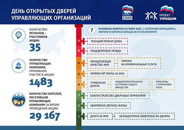 Во Всероссийской «Единой России» «День открытых дверей управляющих организаций», организованной партпроектом , приняли участие 1483 управляющие организации из 35 регионов. В общей сложности, к управляющим организациям (УО) обратились 29 167 человек.