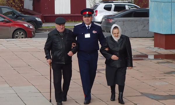 Волонтеры на патрульной машине привезли ветерана вместе с супругой на избирательный участок, где они не только проголосовали, но и пообщались с молодыми избирателями.