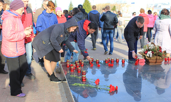 Участники акции почтили память погибших минутой молчания, а затем поставили к обелиску Победу зажженые свечи и положили цветы.