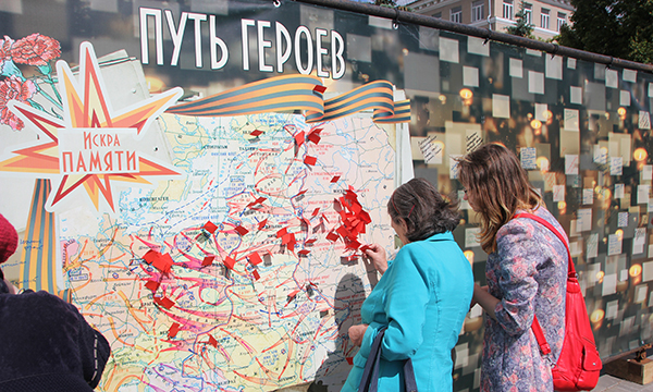 Все желающие приняли участие в акции «Вспомни. Сделай. Приди» - туляки по традиции прикрепили бумажных голубей к голубому полотну, символизирующему небо. Также на площади была установлена интерактивная карта территории СССР и Европы времен Великой Отечественной войны «Путь героев», на которой каждый с помощью специального флажка смог сделать географическую отметку места, где воевал или погиб его родственник, написать его имя.