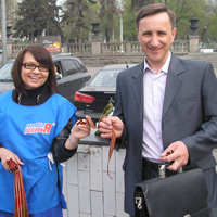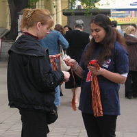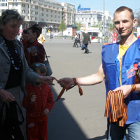 Активисты Московского городского отделения «Молодая Гвардия Единой России» в период майских праздников начали раздачу ленточек для жителей столицы. Ребят можно увидеть возле станций метро, в парках, рядом с учебными заведениями.