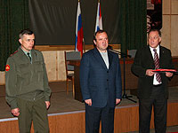 Виктор Селиверстов от имени Московской организации Партии "Единая Россия" вручил музею копию Знамени Победы, которое теперь тоже займет достойное место в музейной экспозиции.