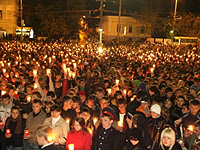Во Владикавказе, на Театральной площади, собрались более 4 тысяч человек. Траурное собрание спустя 40 дней после развязанной Грузией войны началось с минуты молчания, после которой каждый пришедший в память о безвинных жертвах зажег свечу.