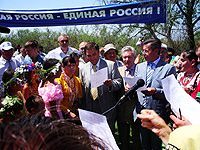 Самодеятельных артистов и жителей Бахтемира тепло приветствовали губернатор Астраханской области Александр Жилкин и вице-спикер Госдумы, Секретарь Президиума Генерального совета партии "Единая Россия" Вячеслав Володин.