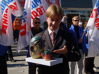 К слову, у награды уже появился первый обладатель. Вчера им стал Гарри Каспаров, посетивший с визитом Челябинск. Статуэтка, изображающую голову человека с непомерно длинным языком, придавленным "молодогвардейским" ботинком была вручена Каспарову прямо на входе в здание, где он планировал принять участие в круглом столе. "Вам как самому большому политическому вруну современной России мы вручаем эту награду. Ни одному человеку кроме вас не удается столь энергично пытаться продать Западу Россию по сходной цене, прикрывая это отстаиванием демократических свобод. Вы заслужили эту награду", - с такой парадной речью челябинские "молодогвардейцы" презентовали Каспарову заслуженный приз. Гарри Кимович принять подарок постеснялся, посчитав, очевидно, что его заслуги на ниве политического словоблудия пока еще не так велики.