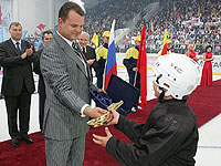 Перед матчем, посмотреть на которой пришли тысячи болельщиков, выступил президент Федерации хоккея, трехкратный олимпийский чемпион России Владислав Третьяк. Он горячо поздравил жителей со столь знаменательным событием и поблагодарил "капитана" - Бориса Громова и его команду за этот подарок: "Я желаю командам показать хороший хоккей, который мы любим, и надеюсь, что на этом стадионе появятся новые Фетисовы, Харламовы, Михайловы, которые прославят нашу страну, и Гимн России всегда будет играть в честь победы наших хоккеистов на чемпионатах мира!".