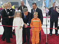 Вслед за этим на арену выехал симпатичный пингвин в сопровождении мальчика в хоккейной форме и девочки-фигуристки. Владимир Самоделов передал им символический "ключ" от Арены и дети вместе с Губернатором и главой округа перерезали символическую ленточку, открыв Ледовый дворец.
