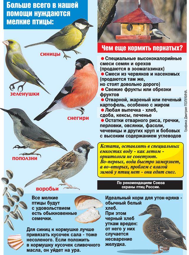 – Главный принцип зимнего питания птиц – побольше калорий, – рассказывает Виктор Зубакин. – А вот хлебные крошки могут быть опасны. Хлеб почти всегда сыроват. На морозе влага замерзает, и крошки, жесткие, как лед, могут поранить птицам горло.