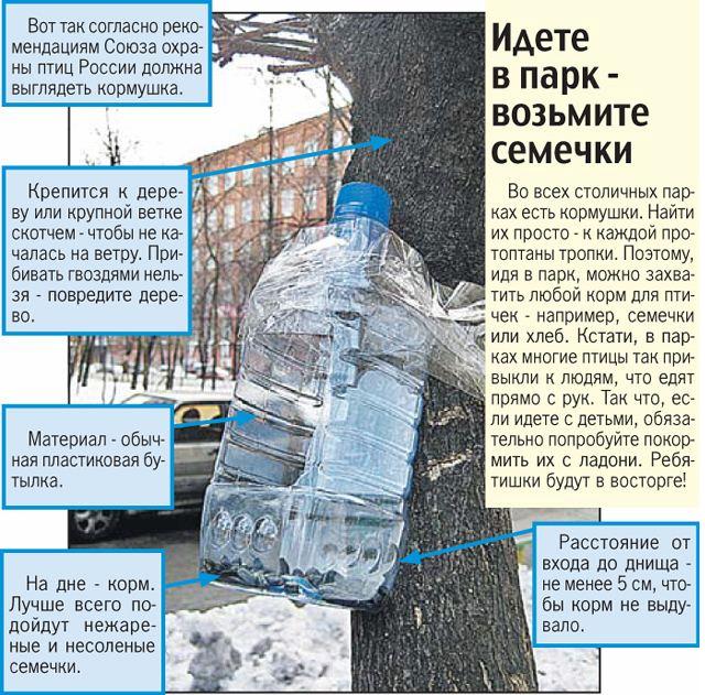 По словам орнитологов, пернатые зимою гибнут не столько от холода, сколько от голода. Если люди не помогут, 70% птиц в столице не переживут зиму. В морозы птицы тратят значительно больше энергии, чтобы согреться. Если начнется массовая гибель пернатых, то уже ближайшим летом сильно расплодятся жуки-короеды, тополиная тля и другие вредители. В итоге деревья – и без того ослабленные загрязненным воздухом и почвой - начнут чаще болеть и засыхать. Больше всего в нашей помощи нуждаются мелкие птицы: синицы, зеленушки, снегири, воробьи и поползни. Орнитологи советуют: чтобы не дать пернатым замерзнуть зимой, достаточно сделать кормушку и периодически ее пополнять. Стать местом для трапезы пернатых может обычная пластиковая бутылка.