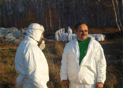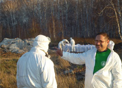 На снимках член Центрального Совета Российского экологического движения «Зелёные» П.Н. Черногривов руководит работой по вывозу пестицидов и агрохимикатов с истекшим сроком годности и запрещенных к применению на Полигон токсичных отходов г. Томска.