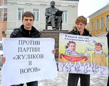 В 12.45 делегация, выбранная из участников пикета, направилась в городскую избирательную комиссию, где вручила председателю ЦИК В.Чурову символы победы партии «Единая Россия» на всех прошедших выборах: административный лом, полицейскую дубину и мыльные пузыри, которые олицетворяют предвыборные обещания «Единой России».